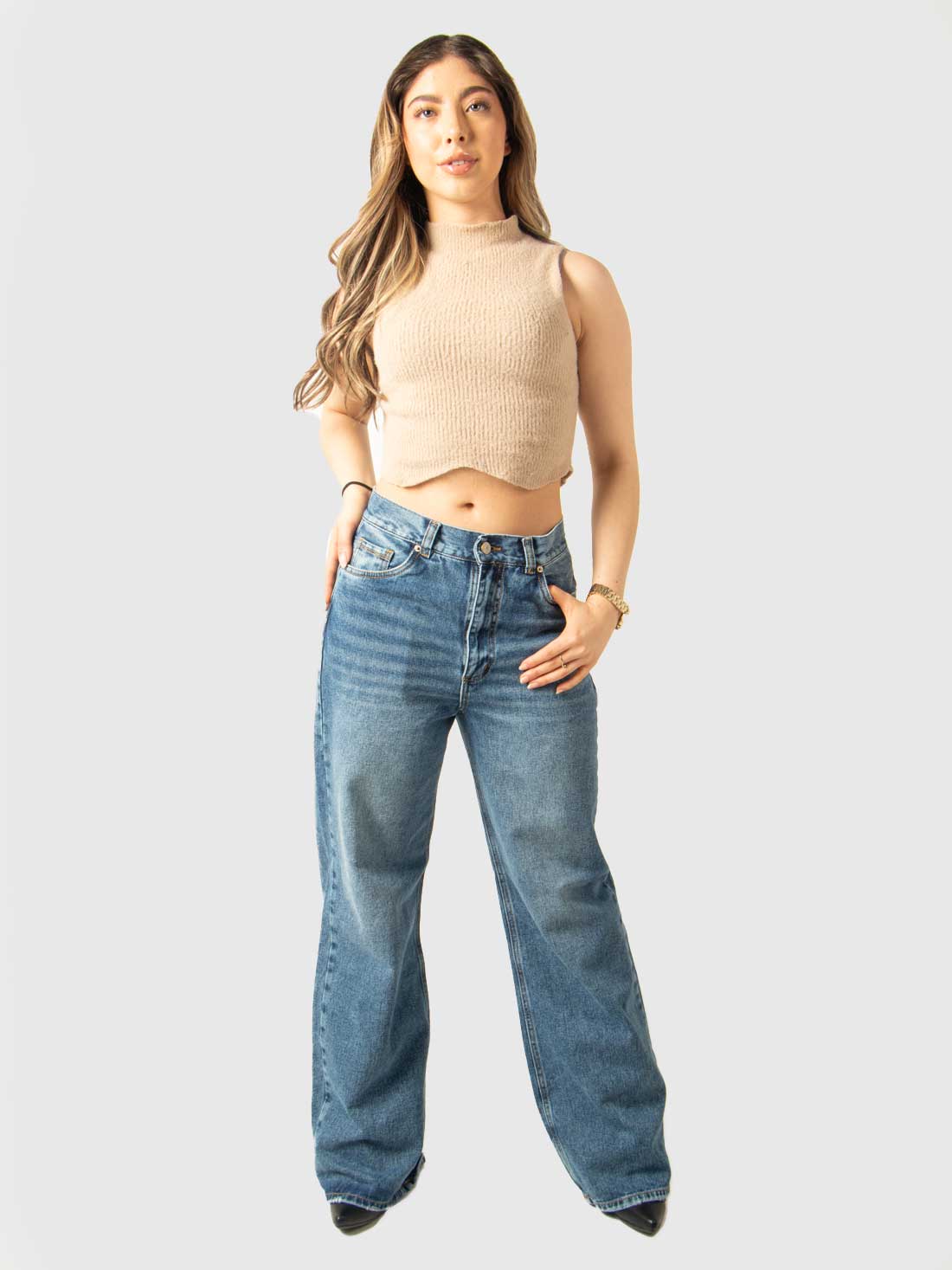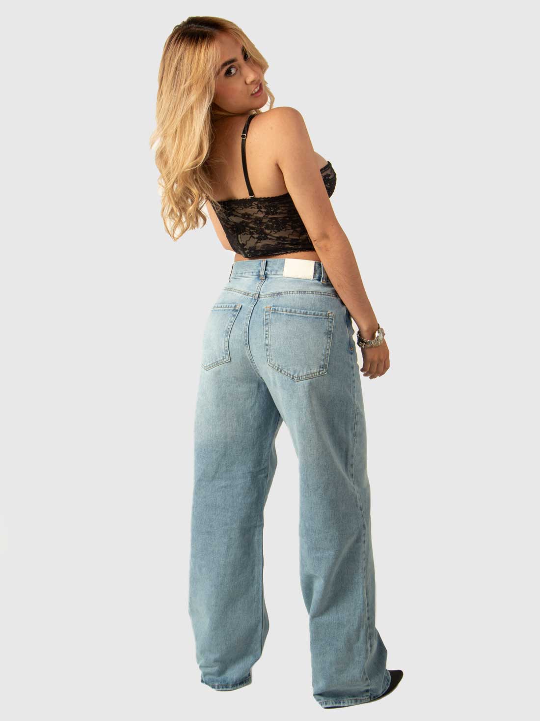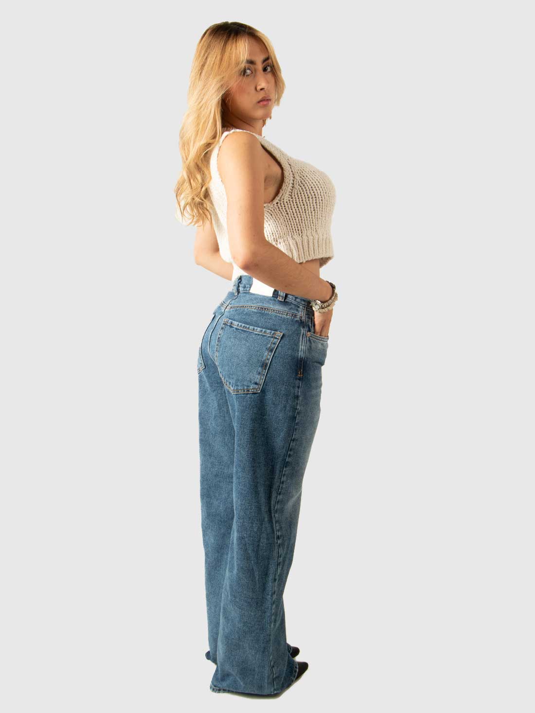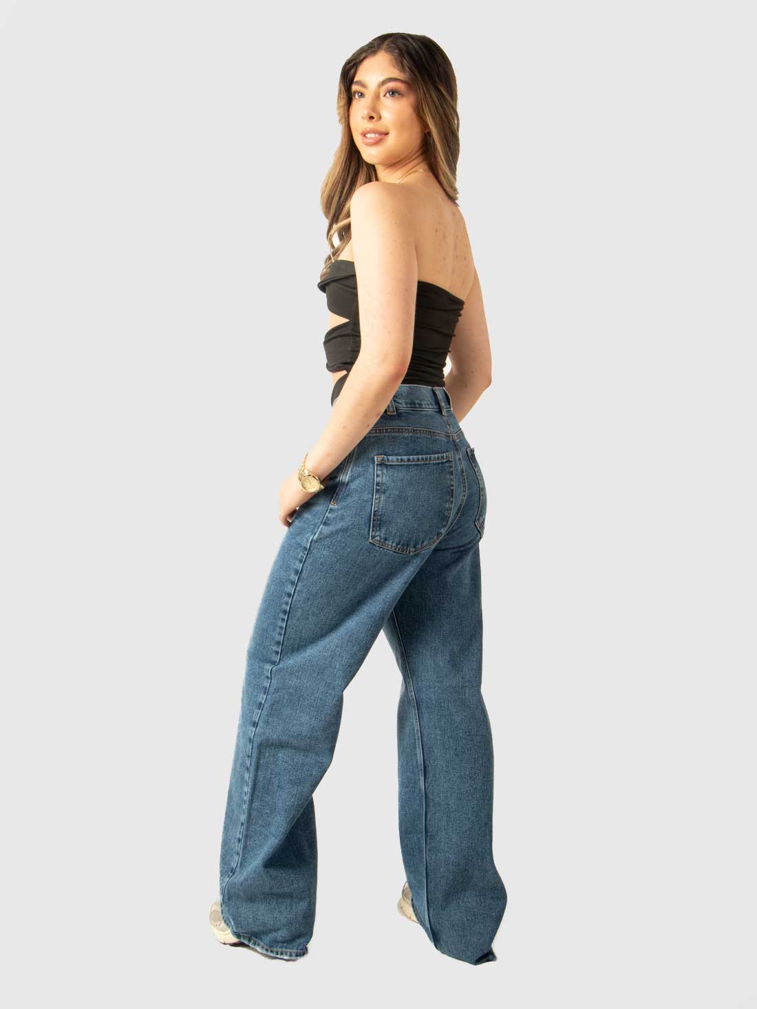 Descubre nuestro jean baggy para mujer  , diseñado para combinar estilo y funcionalidad.  Este pantalón cuenta cinco bolsillos. Cierre frontal con cremallera y botón.