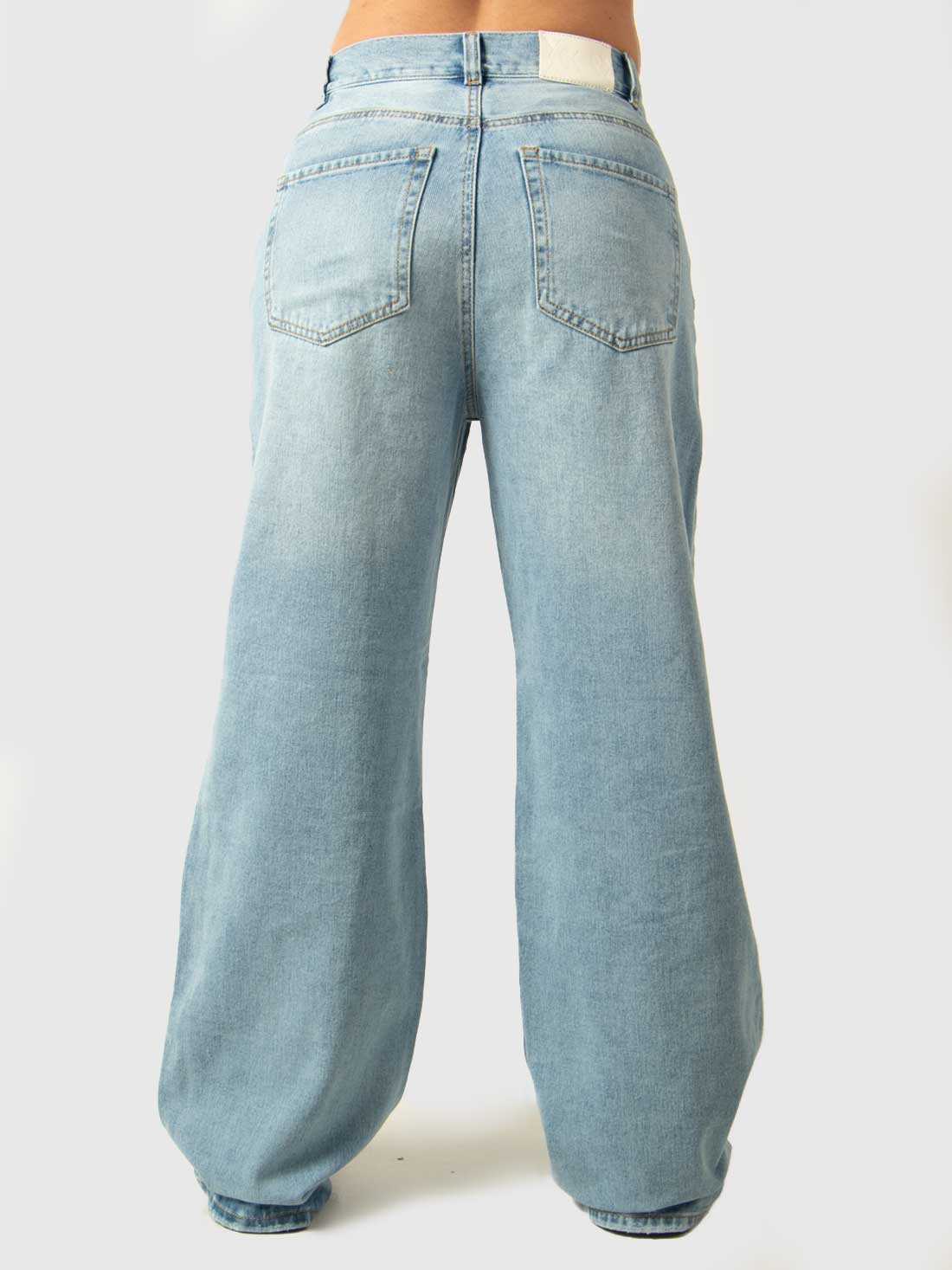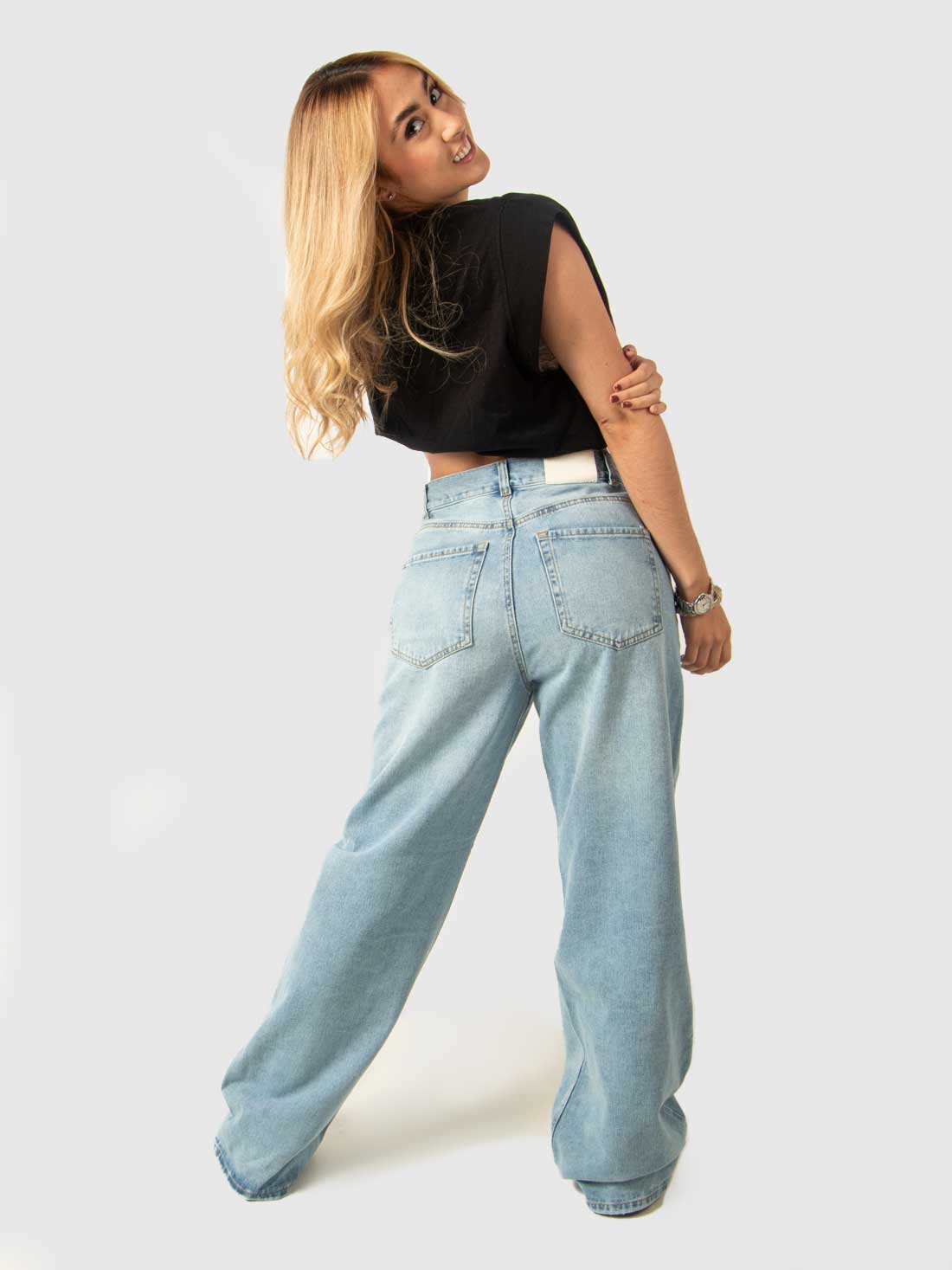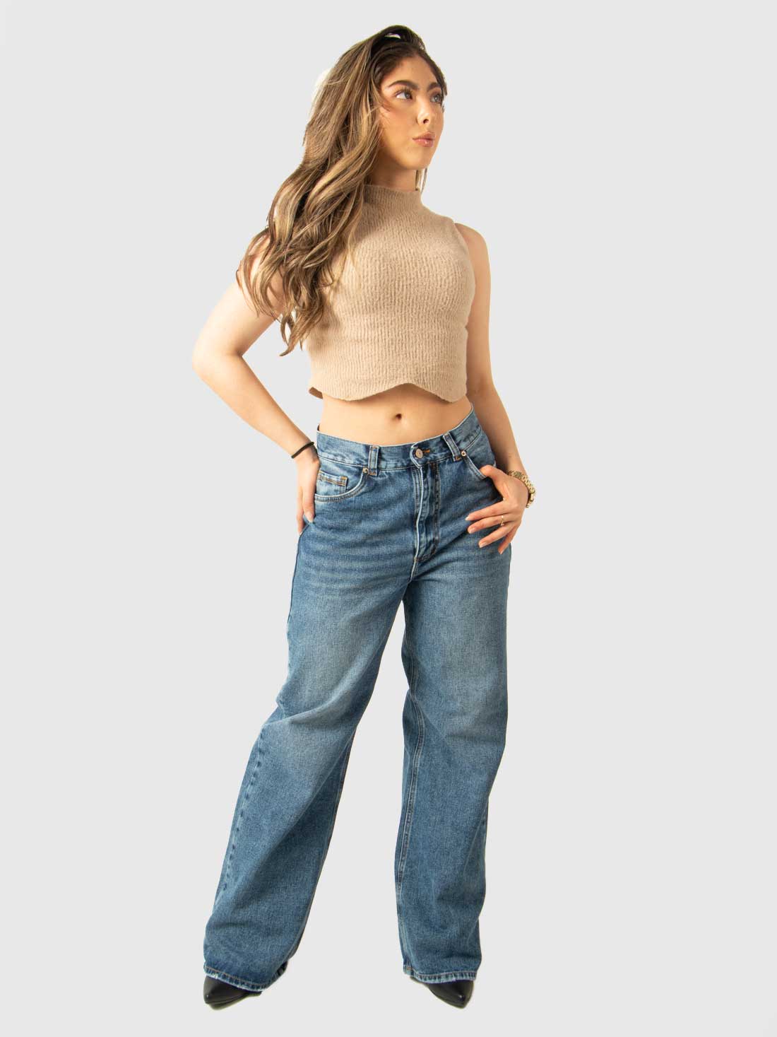 Descubre nuestro jean baggy para mujer  , diseñado para combinar estilo y funcionalidad.  Este pantalón cuenta cinco bolsillos. Cierre frontal con cremallera y botón.