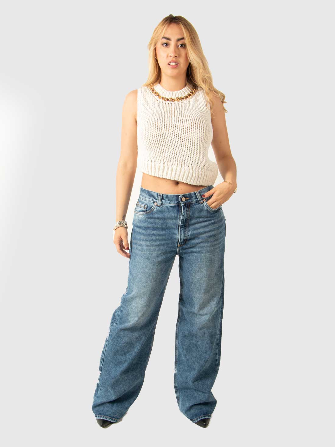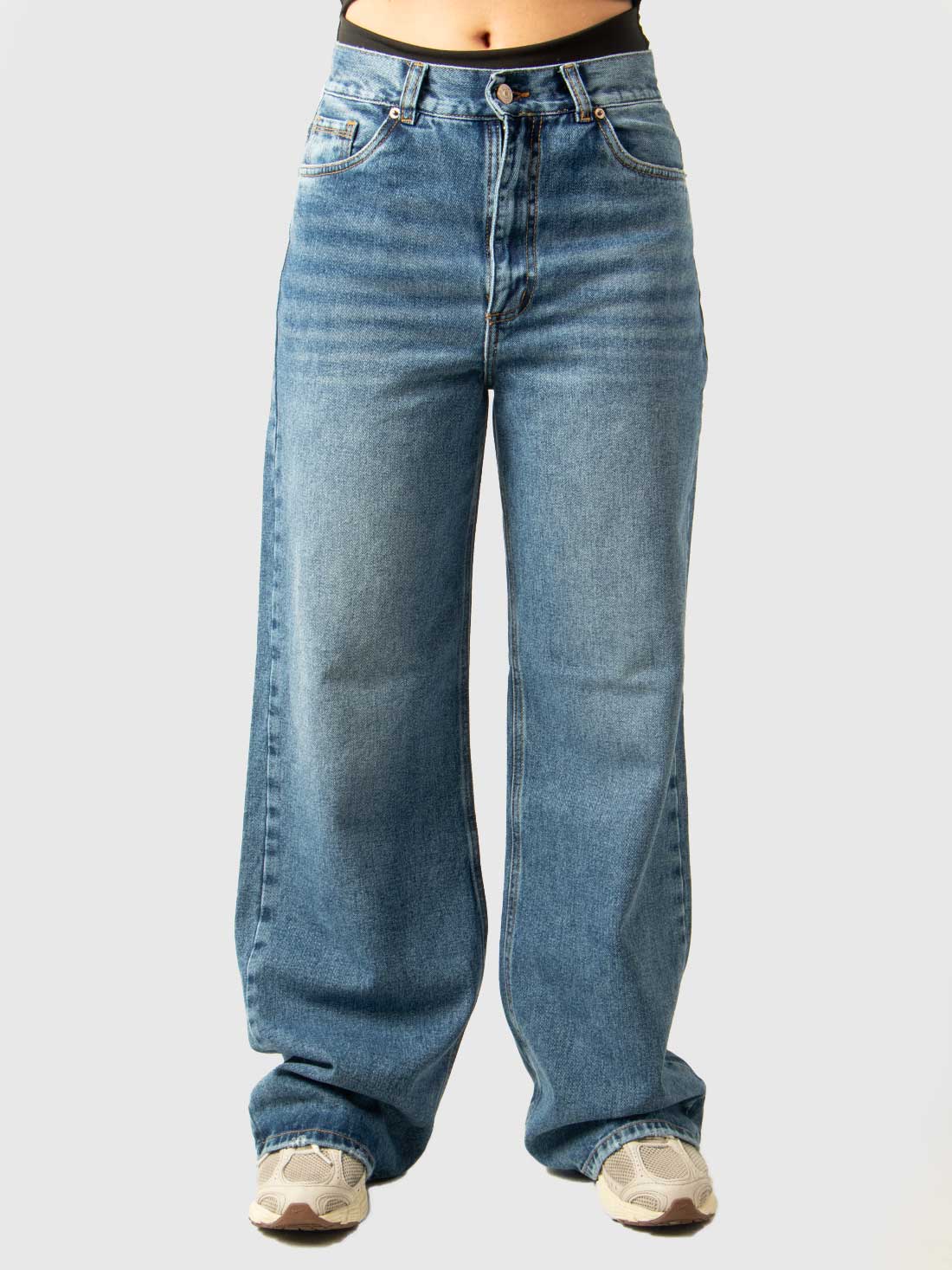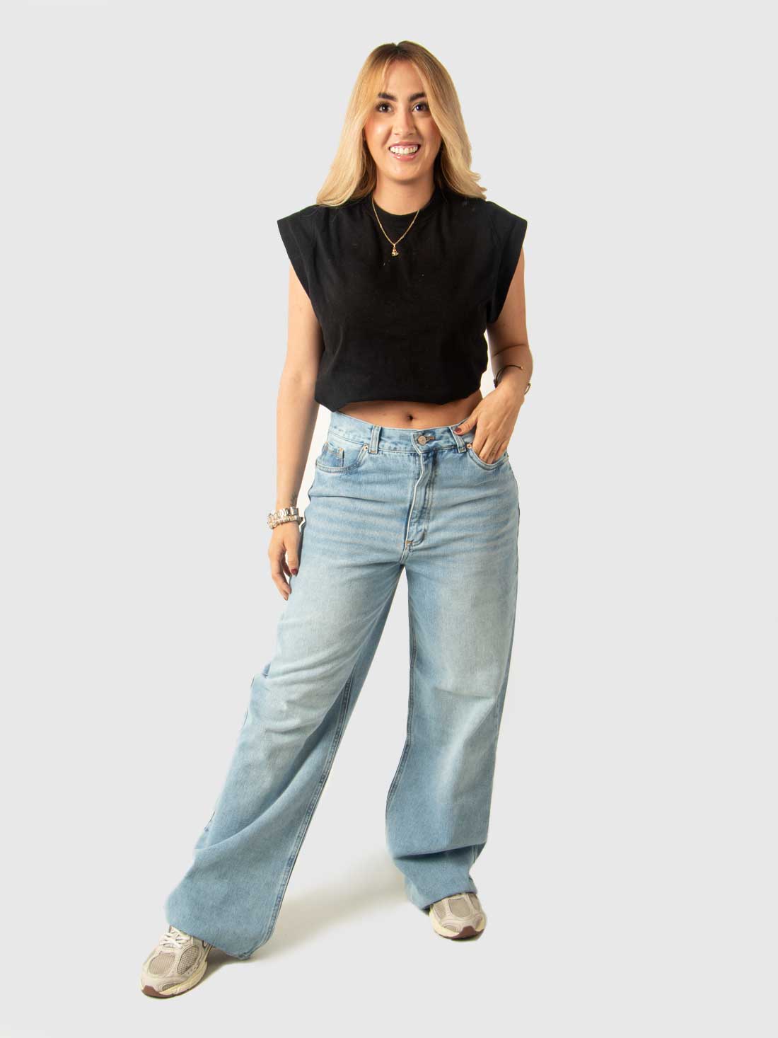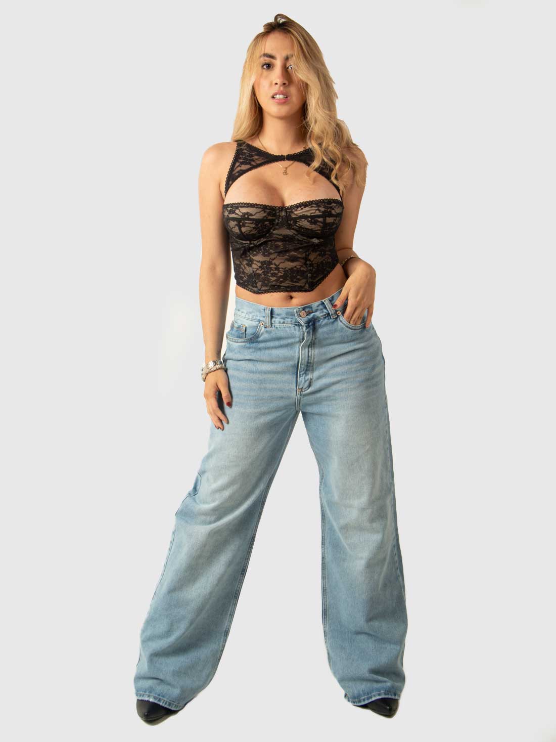 Descubre nuestro jean baggy para mujer  , diseñado para combinar estilo y funcionalidad.  Este pantalón cuenta cinco bolsillos. Cierre frontal con cremallera y botón.